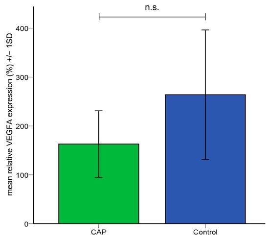 As the immunohistochemical analysis revealed a significant reduction of vessel density after CAP treatment in the tumor tissue, VEGF dependency was evaluated by quantification of VEGF mRNA using qRT-PCR. VEGF expression in the CAM tissue was not significantly reduced after CAP treatment in the quantitative RT-PCR (Figure 4). We compared native CAMs without tumors after 4 × 60 s CAP (n = 3) or sham treatment (n = 6). Mean relative VEGF gene expression was lower in CAP-treated CAM tissue (Mean = 163.03%) compared to sham-treated CAM tissue (Mean = 263.93%), but differences between groups did not reach the level of statistical significance (student’s t-test, p = 0.265) suggesting no or low effects of CAP on VEGF gene expression.