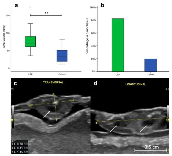 Ultrasonographically assessed tumor volume and hemorrhages. (a) Boxplot of tumor volume in specimens after CAP or sham treatment (CAP: n = 17, Median = 69.1, IQR = 31.9; sham: n = 15, Median = 32.1, IQR = 33.9). CAP-treated tumors demonstrated significantly increased tumor volume compared to untreated tumors (p < 0.01); (b) Intratumoral hemorrhage was observed in 82.4% of CAP-treated tumors and 20% of sham-treated tumors; (c) Ultrasonographic image of the inoculated tumor in CAM in the transversal axis (d) and the longitudinal axis. Scale bar length 500 µm. Arrows indicate intratumoral hemorrhage. ** p < 0.01.