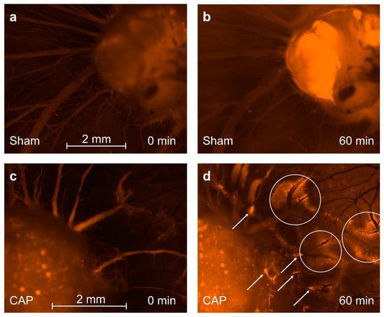 Intravital fluorescence imaging of tumor and surrounding blood vessels. Exemplary image of tumor (a) before and (b) past 60 min of 60 s sham treatment. A general increase of fluorescence could be observed. Intensification of fluorescence was mainly focused on tumor tissue and the CAM, distancing the tumor approximately 50 µm. Blood vessels surrounding the tumor appeared to be intact. Thrombosis or obliteration of blood vessels did not occur. Tumor (c) before and (d) past 60 min of 60 s CAP exposure. Increased extravasation of 70 kDa TRITC-dextran could be observed in tumor-associated CAM tissue (white circles). Vascular obliterations and thrombi occurred in several blood vessels (white arrows). Scale bar length 2 mm.