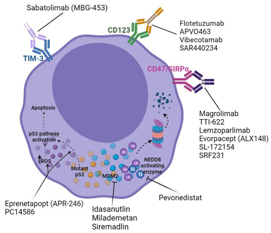 PC14586 is another oral small molecule “reactivator” of the mutant p53 protein specifically characterized by a Y220C mutation, which constitutes <5% of all mutations in TP53m-AML [2]. This agent is currently being studied in a phase 1/2 trial of patients with advanced solid tumors with TP53 Y220C (NCT04585750) but may soon extend to TP53m-AML. Despite these efforts, more recent data has suggested that mutant TP53 may not be a biomarker of the response to these types of agents. Preclinical data demonstrated that the mutated p53 protein binds to NRF2, an antioxidant transcription factor that ultimately decreases the expression of the cysteine/glutamate antiporter SLC7A11 [73]. As an important negative regulator of ferroptosis, a nonapoptotic cell death mechanism, decreased SLC7A11 may be an appropriate biomarker of the response, which is also associated with a decrease in glutathione and, thus, an increase in reactive oxygen species (ROS) with resultant cellular stress and death [73,74]. Indeed, preclinical experiments on the AML cell lines have shown that eprenetapropt leads to glutathione depletion and the induction of ferroptosis irrespective of the TP53 status [75]. In sum, these agents may not be mutant p53 “reactivators” or “refolders”, and more study is needed to determine more accurate predictive biomarkers.