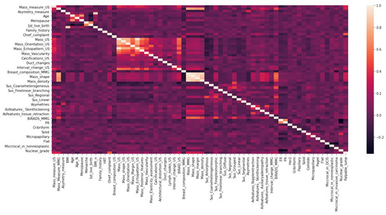 Mammographic findings were also interpreted using BI-RADS criteria [14], specifically those of the masses (size, shape, density, and margin), calcifications (morphology and distribution), and architectural distortion. Asymmetries in density and morphology were also recorded. Interval changes on follow-up mammograms (MMGs) were also reviewed. The MMG features used in the models are provided in detail in Appendix A (Table A1).
