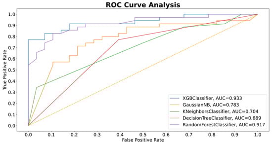 The performance of this classification model, using XGBoost, was compared with those of four other algorithms, using the F1 score, recall score, accuracy, precision, and AUC. Results are shown in Table 3 and Figure 5. All five methods showed good results in F1 score, accuracy, and recall; however, XGBoost and the random forest classifier models performed the best using these metrics.