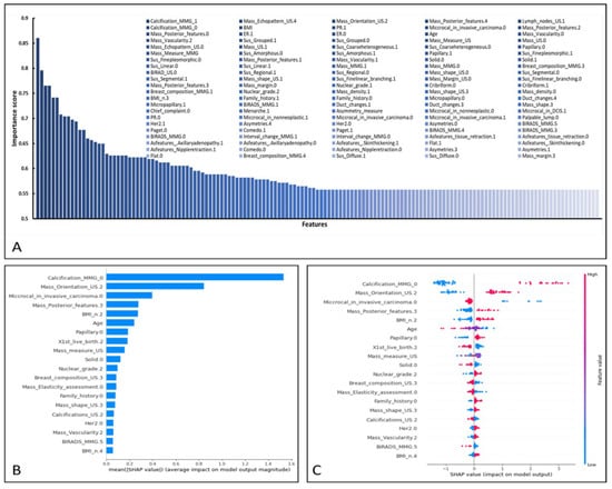 (A) Feature importance according to XGBoost. (B,C) Contribution of the top 20 features as ranked by SHapley Additive exPlanations (SHAP). The features are arranged in descending order on the y-axis according to their mean absolute influence on classification. Each dot represents the SHAP value for a certain feature for a certain patient. The SHAP algorithm evaluates all conceivable combinations of features, including and excluding a given feature to evaluate its contribution to the prediction. The farther away from the y-axis (positive or negative x) a dot is placed, the more impact this attribute has on the machine learning model output for that woman. Dot color indicates the feature’s original value from low (blue) to high (magenta), as indicated by the color array stripe on the right. The color was determined separately for each feature based on the patient’s feature values.