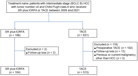 In our institution, the indications for SR plus IORFA in patients with BCLC B HCC and preserved liver function include (a) a completely resectable main HCC; (b) ≤3 remnant HCC nodules, each ≤3 cm in maximum diameter; and (c) if SR alone had a high risk of insufficient FLR or was impossible due to unfavorable tumor locations, as determined by a multidisciplinary team. To increase the comparability of SR plus IORFA with TACE, treatment-naïve patients with HCC were included if they (a) underwent SR plus IORFA or TACE as first-line treatment between January 2009 and December 2021; (b) were diagnosed with intermediate (BCLC B)-stage HCC and had ≤4 nodules; (c) had Child–Pugh class A liver function; and (d) had an Eastern Cooperative Oncology Group performance status of 0. Patients were excluded if they had (a) major vascular invasion or extrahepatic metastasis, (b) Child–Pugh class B or C liver function, or (c) previous or current malignancy other than HCC. Patients were also excluded if they were lost to follow-up after SR plus IORFA or TACE, and patients in the TACE group were excluded if they had undergone preoperative TACE. The physicians explained the treatment options to all eligible patients, with the treatment modality for each patient chosen after considering the preferences of the physician and patient, as well as the cost.