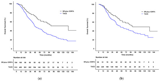 Several studies have compared SR plus IORFA with TACE in PSM patients with multifocal HCC [12,29]. For example, a comparison of 26 patients who underwent SR plus IORFA and 153 who underwent TACE found that OS rates were significantly higher (p = 0.011), and time to progression significantly longer (p < 0.001), in the SR plus IORFA group [12]. Both univariate and multivariate analyses of the PSM population found that combined therapy was significantly associated with OS and time to progression. A comparison of 59 patients who underwent SR plus IORFA and 410 who underwent TACE found that the 1-, 2-, and 3-year cumulative OS rates were 81.8, 68.7, and 63.4%, respectively, in the SR plus IORFA group, and 59.3, 36.1, and 19.4%, respectively, in the TACE group, after PSM (p < 0.001) [29]. Subgroup analysis found that SR plus IORFA was associated with better OS outcomes in all subgroups. Those studies, however, included smaller patient populations and did not report long-term outcomes. In addition, although those studies reported p-values, they did not report standardized mean differences before and after PSM, a more appropriate comparison when analyzing propensity-matched population status.