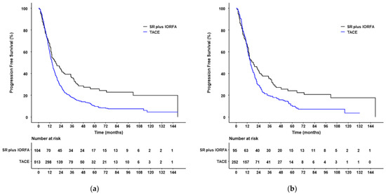 Kaplan–Meier analyses of progression-free survival (PFS) in patients who underwent SR plus IORFA or TACE before (a) and after (b) PSM. (a,b) PFS rates were significantly higher in patients who underwent SR plus IORFA group than in those who underwent TACE both (a) before PSM (HR: 0.67 (95% CI, 0.52–0.85), p < 0.001) and (b) after PSM (HR: 0.72 (95% CI, 0.54–0.96), p = 0.023).