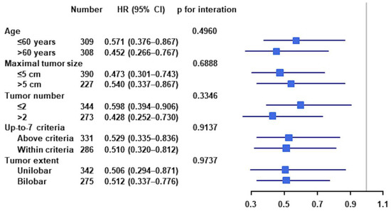 Patients were subgrouped by age (≤60 vs. >60 years), maximal tumor size (≤5 vs. >5 cm), tumor numbers (≤2 vs. >2), up-to-7 criteria (above vs. within), and tumor extent (unilobar vs. bilobar) to determine the effects of these factors on the improved OS in patients who underwent SR plus IORFA compared with TACE. OS was superior in all subgroups of patients who underwent SR plus IORFA to those who underwent TACE group (Figure 5).