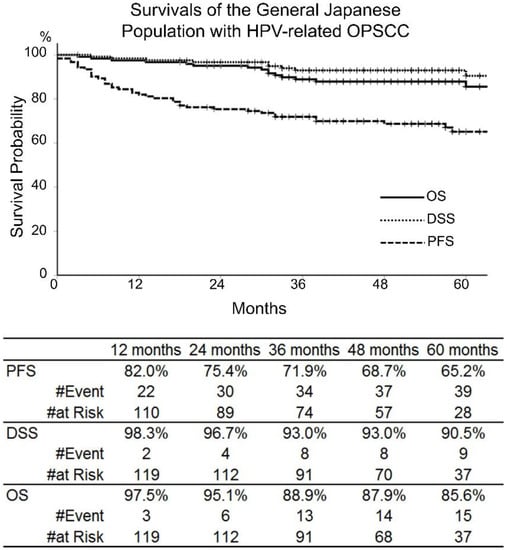 Progression-free survival (PFS), disease-specific survival (DSS), and overall survival (OS) of the 122 patients with human papillomavirus-related oropharyngeal squamous cell carcinoma (HPV-related OPSCC) in the clinical stages III and IV, according to the TNM 7th edition, who were treated between 2010 and 2018.