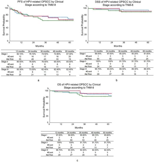 Kaplan–Meier curves. (a) Progression-free survival (PFS). (b) Disease-specific survival (DSS). (c) Overall survival (OS) of human papillomavirus-related oropharyngeal squamous cell carcinoma (HPV-related OPSCC) according to the clinical stage by TNM 8th edition. Blue lines: stage I, red lines: stage II, green lines: stage III. No significant differences were seen in prognoses between clinical stages according to TNM-8.