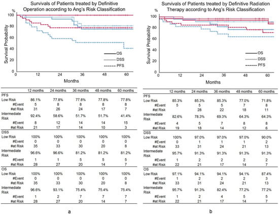 Progression-free survival (PFS), disease-specific survival (DSS), and overall survival (OS) in the patients treated by operation and radiation according to Ang’s risk classification. (a) The patients treated by operation. (b) The patients treated by definitive radiation. Red line: low risk, blue line: intermediate risk.