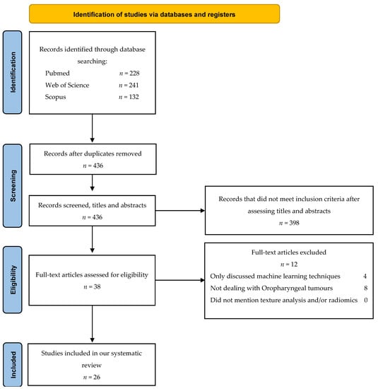Our search included articles published in international peer-reviewed journals based on texture analysis and radiomics of the oropharynx. We also included studies on the head and neck region that contained sections dedicated to the oropharynx. Original articles, case reports, short communications, and letters to the editor were also included. The exclusion criteria were: