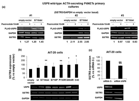 SSTR5 expression is upregulated by USP8 mutants and downregulated by USP8 genetic silencing. (a) Immunoblots of SSTR5 expression in three different primary cultures from USP8-wild type ACTH-secreting PitNETs (#1, #2, #3) transiently transfected with FLAG-S718del USP8 mutant and densitometrical analysis of SSTR5 expression normalized on GAPDH expression (single experiments). (b) Representative immunoblots of SSTR5 expression in AtT-20 cells transiently transfected with USP8 mutants and (c) AtT-20 cells silenced for USP8. The equal amount of protein was confirmed by stripping and reprobing with an anti-GAPDH antibody as housekeeping protein. The graphs show the quantification of SSTR5/GAPDH in all samples tested. *, p < 0.05, **, p < 0.01 vs. empty vector control cells; §§, p < 0.01 vs. SiRNA C-cells.