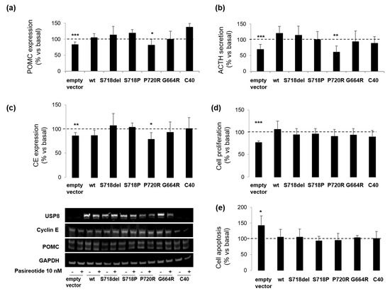 Moreover, as in empty vector transfected cells, pasireotide incubation resulted in a significant decrease of cyclin E levels in P720R USP8 mutant expressing cells, only (−21.4 ± 14.1%, p < 0.05 vs. basal) (Figure 3c). However, this effect was not associated to a reduction of the overall proliferation rate since upon pasireotide incubation, reduction in cell proliferation (−22.8 ± 3.7% vs. basal, p < 0.001) was observed in empty vector transfected cells, only (Figure 3d). Similarly, an increase in cell apoptosis (+42.2 ± 31% vs. basal, p < 0.05) was observed in empty vector transfected cells but not in USP8-transfected cells (Figure 3e).