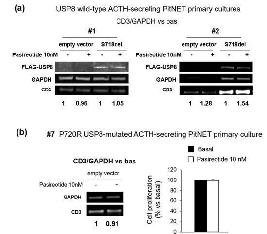 Evaluation of USP8 mutations on cell cycle regulation in human primary cultures. (a) Immunoblots and densitometrical analysis of CD3 expression in primary cultured cells from two independent USP8 wild-type ACTH-secreting PitNETs (#1 and #2) transiently transfected with S718del USP8 mutant for 96 h and incubated with pasireotide 10 nM for 4 h (single experiments). “Bas” is referred to cells incubated without pasireotide. (b) Immunoblot and densitometrical analysis of CD3 expression in primary cultured cells from one P720R USP8-mutated ACTH-secreting PitNET (#7) incubated with pasireotide for 4 h and results of cell proliferation assay obtained in cells treated with pasireotide for 96 h (single experiments). For western blot analysis, the equal amount of proteins was confirmed by stripping and reprobing with an anti-GAPDH antibody as housekeeping protein. The graphs show the quantification of CD3/GAPDH in all samples tested. For cell proliferation assay each determination was done in triplicate. Values represent mean ± SD and are expressed as percent respect to basal untreated cells.