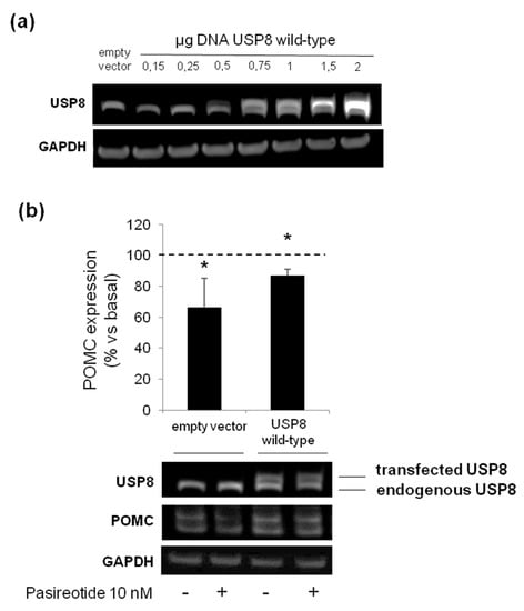 Finally, we attempted to understand whether the lack of responsiveness to pasireotide-mediated antisecretory effects observed in USP8-wild type overexpressing cells was due to an excess of USP8 molecules within the cells. To this purpose, AtT-20 cells were transiently transfected with different amounts of plasmid encoding the USP8 wild type form. According to the plasmid concentration curve shown in Figure 6a, a USP8 wild type plasmid DNA amount of 0.75 μg was chosen as the lowest one resembling those of endogenous USP8 levels. Cells were exposed to pasireotide for 4 h and POMC protein expression levels was evaluated by Western blot. Under these transfection conditions, similarly to what observed in empty vector cells, USP8-transfected cells incubation with pasireotide resulted in a significant reduction of POMC (−13 ± 4% reduction vs. basal, p < 0.05).