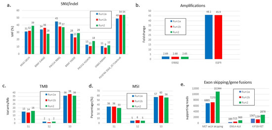 Repeatability and reproducibility of the TSO500 assay for the different types of variants and biomarkers. (a) SNVs and indels, (b) amplifications, (c) TMB, (d) MSI, and (e) exon skipping and gene fusions events. Three samples were analyzed in the same run (intrarun), indicated as Run1a (blue bars) and Run1b (red bars), as well as in another run (interrun), indicated as Run2 (green bars).