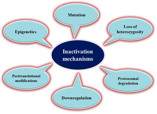 Promoter methylation also regulates gene expression. In some cases, TSG promoter methylation alteration may lead to gene silencing and a loss of function, without the need for gene mutations [70]. Other epigenetic mechanisms have been implicated in TSG inactivation, particularly microRNAs that silence these genes in various cancer types [71]. Post-translational modifications are other inactivating mechanisms observed in proteins encoded by TSGs. For example, PTEN phosphorylation at some specific residues represses its activity [72]. This tumor suppressor may also be inhibited through the oxidation of a cysteine residue in the active site of PTEN [73]. Figure 1 shows some common mechanisms of TSG inactivation in cancer.