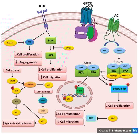 Key tumor-suppressor genes and their related pathways in thyroid cancer. Growth factors bind to their receptor tyrosine kinases (RTK) and activate the PI3K and RAS pathways that could be inhibited by PTEN and RASAL1, respectively. Cell stress triggers CHEK2, which in turn downregulates MDM2, leading to the upregulation of the p53 and p63 tumor-suppressors. P53 can also increase RB expression. DNA damage could lead to p73 upregulation and apoptosis induction. APC inhibits beta-catenin, leading to the inhibition of cell proliferation and migration. Ligand binding to G-protein-coupled receptors (GPCR) induces G-protein and adenylyl cyclase (AC), which increases cAMP and PKA activation. PRKAR1A mutations could cause PKA hyperactivation and cell proliferation induction.
