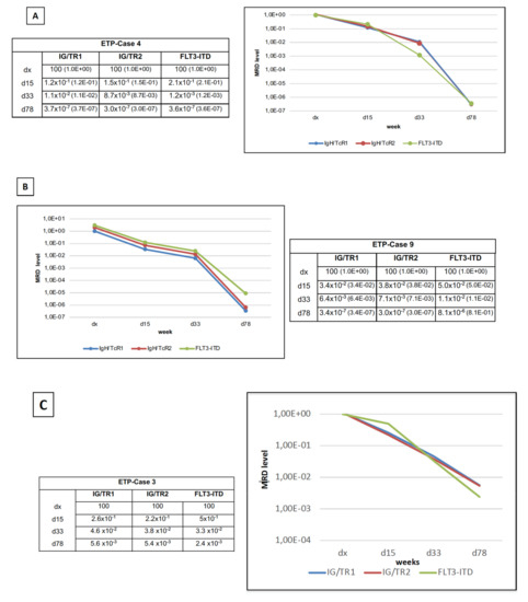 Modern protocols for the treatment of ALL are fully based on detection of MRD along the induction phase [17]. It has been clearly demonstrated that the reduction curves of MRD are different in T-ALL and B-ALL [26]. In fact, although MRD was detectable in the majority of T-ALL patients at the end of induction, they still had a favorable outcome when they showed a low level or undetectable MRD at the end of consolidation, or phase I-B [26,27]. Consistently with its stem cell signature, ETPs frequently lack IG/TR gene rearrangements, the most used and sensitive targets for MRD monitoring. This inconvenience occurred in almost 60% of cases with ETP [12]. For this reason, we investigated the feasibility of MRD detection using FLT3-ITD. We found a potential marker in most cases, showing a strict concordance with TR based MRD methodology (Figure 1), even in non-ETP-ALL with FLT3-ITD (Supplementary Materials—Table S3). However, in case of discrepant results in comparison with IG/TR, we point out that detection of MRD using FLT3-ITD could result negative. This discrepancy could be explained by the presence of FLT3-ITD mutation in a minority of blast cells as secondary mutation, which might be more sensitive to the treatment. Nevertheless, although in a single case, a next generation sequencing (NGS) strategy for detecting MRD in ETP-ALL has been recently applied and was potentially effective in association with WGS analysis for identification of multiple target genes. It is reliable to then estimate the subclonality and to identify an appropriate target for MRD monitoring [28].