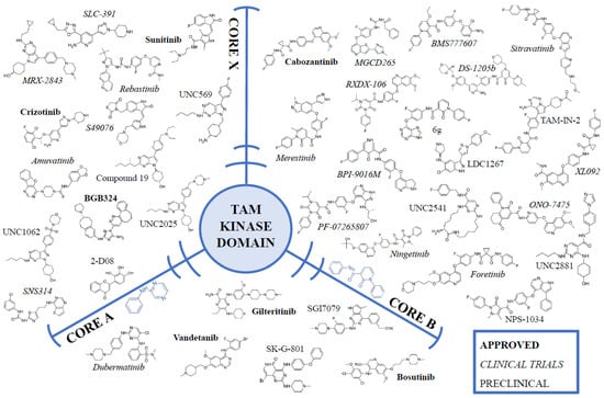 Different structures of TAM family kinase inhibitors. TAM receptors are divided into three groups, based on their base core structure: CORE-A compounds, with hydrogen bond acceptor–substituted phenyl group linked to a hinge-binding heterocycle with a solubilising group; CORE-B compounds, with heterocycle (hinge-binding) optionally ortho-fluoro phenyl group (binding DFG motif), 2–4 hydrogen donors/acceptors, and a phenyl group (or para-fluoro phenyl) (binding to allosteric hydrophobic pockets); and CORE-X compounds, that cannot be clearly assigned to either -A, or -B groups, as they present only partial structural similarity to other cores, or present completely different lead structures. Compounds approved for treatment are presented in bold, compounds currently in clinical trials are presented in italics, and compounds that did not enter the clinical phase are presented in plain text.