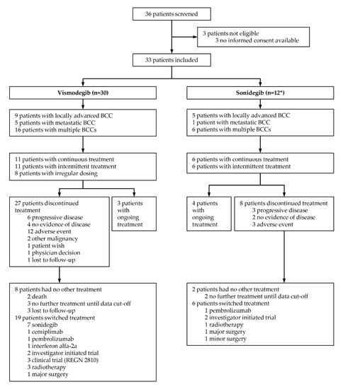 A total of 36 patients had a treatment with a HhI, vismodegib 150 mg daily or sonidegib 200 mg daily, for at least one month outside a clinical study in our center between October 2013 and October 2021. Three patients had no informed consent for a retrospective data analysis and were excluded, leaving 33 patients from which 21 patients had monotherapy with vismodegib (64%), 3 patients with sonidegib (9%) and 9 patients (27%) had both drugs subsequently (Figure 1).
