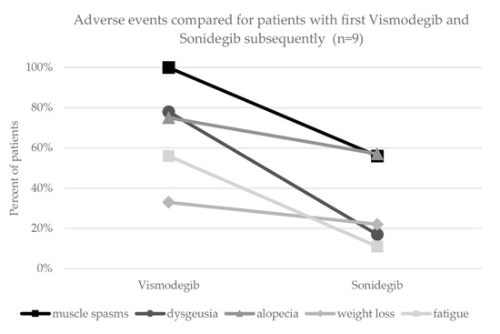By comparing the prevalence of adverse events between vismodegib and sonidegib, we found dysgeusia to be more frequent for vismodegib (n = 24, 80%) than sonidegib (n = 3, 30%). Alopecia, muscle spasms, weight loss and fatigue were also more frequent for vismodegib (Table 1). The analysis of adverse events for patients with both vismodegib and sonidegib subsequently (and same dosing regimen) showed a reduced occurrence of all assessed adverse events during treatment with sonidegib (Figure 2).