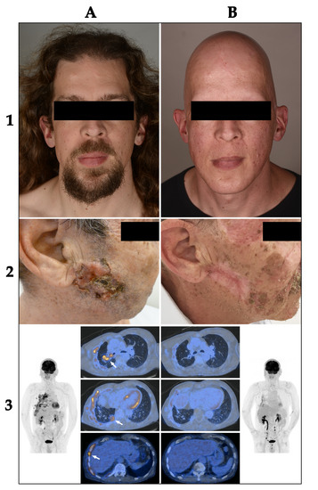 Treatment response and adverse events of HhIs (1): Patient before treatment (1A) and after 13 months of therapy with vismodegib with complete hair loss (1B). (2): Locally advanced BCC on the right cheek before (2A) and after 6 months of treatment with vismodegib (2B). (3): 18F-FDG-PET/CT imaging prior to HhI treatment in 06/2017 (3A) and after 3 months of therapy with vismodegib in 09/2017 (3B). Several pulmonary and pleural metastases (arrows) demonstrated complete metabolic response in the follow-up scan in 09/2017. (1–3) are all different patients.