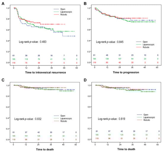 Kaplan–Meier survival analyses estimated intravesical recurrence-free survival (A), progression-free survival (B), cancer-specific survival (C), and overall survival (D), stratified by the surgical approach. Red, robotic; green, laparoscopic; blue, open radical nephroureterectomy.
