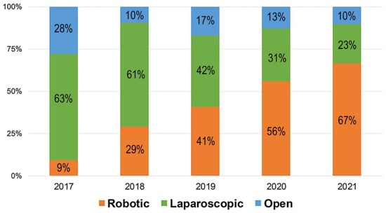 Proportion of radical nephroureterectomy stratified by the surgical approach.