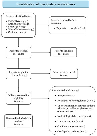 Predetermined inclusion and exclusion criteria were set. Studies were included if they: (1) involved ≥1 patients with histologically confirmed gliomas involving the corpus callosum as explicitly mentioned by the authors or extracted from radiological images; (2) reported data on clinical features, treatments, and outcomes; (3) were written in English. Studies were excluded if they were: (1) reviews, conference abstracts, animal studies, or autopsy reports; (2) studies with unclear distinction between patients with G-I-CC and without; (3) studies lacking data on ≥2 of the following: clinical characteristics, histomolecular alterations, treatments, and/or outcomes. In the case of studies with overlapping cohorts, only the ones with the longest follow-up were included.