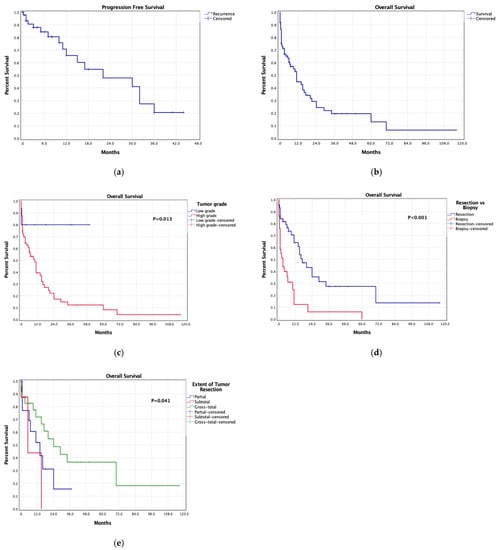 Kaplan–Meier survival curves: (a) pooled progression-free survival, (b) pooled overall survival, (c) overall survival based on tumor grade, (d) overall survival based on resection versus biopsy in patients with high-grade G-I-CC receiving adjuvant treatments, (e) overall survival based on the extent of tumor resection in patients with high-grade G-I-CC receiving adjuvant treatments.