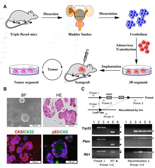 - Mullenders, J.; de Jongh, E.; Brousali, A.; Roosen, M.; Blom, J.P.A.; Begthel, H.; Korving, J.; Jonges, T.; Kranenburg, O.; Meijer, R.; et al. Mouse and human urothelial cancer organoids: A tool for bladder cancer research. Proc. Natl. Acad. Sci. USA 2019, 116, 4567–4574. [Google Scholar] [CrossRef] [PubMed]