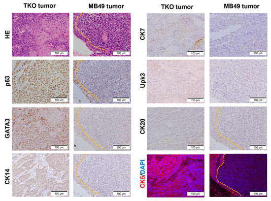 The expression of urothelial markers in TKO intravesical tumors. Sections from the TKO and MB49 intravesical tumors were stained by IHC and IHC-IF with urothelial lineage markers. The TKO tumors are positive for p63, GATA3, CK14 (weak), CK5, and CK7 (patchy), whereas the M49 tumors are negative for urothelial lineage markers. Note the strong positive stain of p63 and CK5 in the normal urothelium adjacent to the MB49 tumors (yellow dash line).