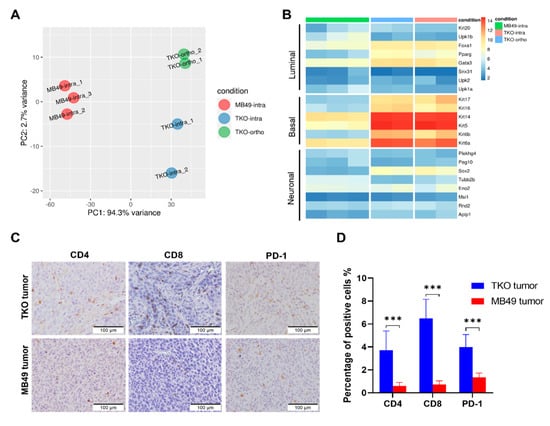 The molecular and immune characterization of TKO tumors. (A) The inter-and intra-group variability of the TKO tumors was illustrated by the principal component analysis (PCA) of the RNA-seq data. Each dot represents a tumor: TKO intravesical tumors (TKO-intra, blue), TKO orthotopic tumors (TKO-ortho, green), and MB49 intravesical tumors (MB49-intra, red). (B) Clustering heatmap of TKO intravesical tumors (pink), TKO orthotopic tumors (blue), and MB49 intravesical tumors (green) using the luminal/basal/neuronal classifier. (C) Representative IHC staining of CD4, CD8, and PD-1 in subcutaneous tumor tissues. (D) The quantification of CD4, CD8, and PD-1 positive cells in subcutaneous tumor sections stained by IHC. p-value, ANOVA with Tukey’s multiple comparisons test, p < 0.001 (***).