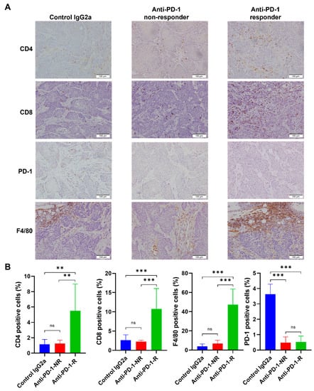 IHC staining of CD4, CD8, PD-1, and F4/80 in control and anti-PD-1 treated TKO tumors. (A) Representative IHC staining (CD4, CD8, PD-1, and F4/80) is shown in control IgG2a, anti-PD-1 (non-responders), and anti-PD-1 (responders). (B) The quantification of the percentages of CD4, CD8, PD-1, and F4/80 positive cells in the TKO tumors treated with control IgG2a, anti-PD-1 (non-responders), and anti-PD-1 (responders). p-value, ANOVA with Tukey’s multiple comparisons test, p < 0.01 (**), and p < 0.001 (***).