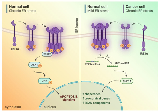 Different outputs of IRE1α activation depending on ER stress duration and type of affected cell: In non-cancerous cells, mild ER stress induces cytoprotective response via splicing of XBP1 mRNA, whilst chronic ER stress switches IRE1α activity rather toward induction of TRAF2/ASK1/JNK pro-apoptotic pathway. Cancer cells which exhibit chronic ER stress conditions due to their specific microenvironment are able to omit UPR-induced cell death. The intensity of IRE1α-dependent XBP1 splicing in these cells is significantly increased.