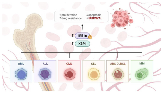 IRE1α-dependent signaling in blood cancer cells: The increased expression of IRE1α and its major substrate XBP1 may be observed in various hematological malignancies, including AML, ALL, CML, CLL, ABC DLBCL, or MM. In most cases, activation of IRE1α–XBP1 pathway results in enhanced proliferation and chemoresistance of cancer cells, while the rate of apoptosis is decreased, and patient survival is significantly poorer, compared with the mentioned tumor-non-expressing UPR-related proteins.
