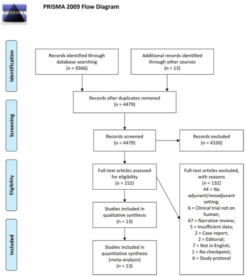 A systematic literature review was performed by querying PubMed/Medline, OVID and Scopus to identify prospective clinical trials published from January 2000 to September 2020 on immune checkpoint inhibitors therapies in muscle-invasive BC. Relevant urologic and oncologic congresses’ abstracts and journals were hand-searched to analyse further evidence. Different combinations of word algorithms were used for the literature search, which included the following entries and synonyms: Immunotherapy, PD1, PD-L1, CTLA-4, adjuvant, neoadjuvant, urothelial cancer, bladder cancer and immune checkpoint inhibitors. The search was also extended to references listed in the manuscripts included in the analysis. Data extraction was conducted to extrapolate data regarding the authors, publication year, study population, the number of participants and the treatment phase from each relevant article. The inclusion criteria were: published full articles and meta-analyses on humans; adjuvant and/or neoadjuvant therapies; patients ≥18 years of age; and English-written articles. ClinicalTrials.gov was also assessed for completed and ongoing clinical trials related to bladder cancer patients treated with immune checkpoint inhibitors. The article selection proceeded according to the Preferred Reporting Items for Systematic Reviews and Meta-Analysis (PRISMA), with the related flow diagram reported in Figure 1.