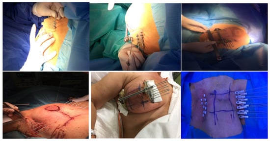 The standard procedure for breast catheter insertion consists of a transcutaneous approach. Metallic needles are manually inserted around the open/close cavity created during a lumpectomy, using a plastic guide template with needle holes to achieve geometric dose distribution. The needles are spaced to form equilateral triangles of 12–20 mm, according to the Paris System [12], then inserted in two to four planes, starting from the inferior plane to ensure an acceptable dose coverage to the deep tumor cavity under direct visualization (intraoperative), or guided by ultrasound images (postoperative). The deepest implant plane should be dorsal to the seroma, while the most ventral one should be placed between the skin surface and the seroma. Special care must be taken so that the needles are positioned at a distance of at least 1 cm from the skin surface to avoid late skin toxicity. At the end of the procedure, in the case of an open cavity (seroma), the needles can be replaced by plastic tubes. The number of applicators and tubes varies according to the size of the tumor cavity and breast anatomy (Figure 1) [13,14]. Once the needle positioning has been completed and the adequacy of the implant has been verified, a computed tomography (CT)-based simulation for target volume delineation and radiotherapy planning will be performed. If no appropriate target volume coverage is detected on the simulation CT scan, a few additional catheters may be inserted freehand without the use of a template.
