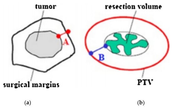 Definition of safety margins. (a) Minimal resection margin. (b) Safety margin, > 20 mm minus A. PTV: planning target volume.