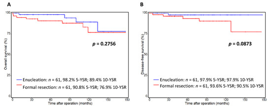 Survival of resected non-functional pNEN—enucleation versus formal resection. Overall survival (A) and disease-free (B) survival rate of 61 enucleated patients (blue line) and 61 formally resected patients (red line). Exclusion criteria: functional pNEN; Ki-67 > 20%. Patients alive at the point of last follow-up were censored. p < 0.05 was determined as the level of significance, OS: overall survival; DFS: disease-free survival. YSR: year-survival rate.