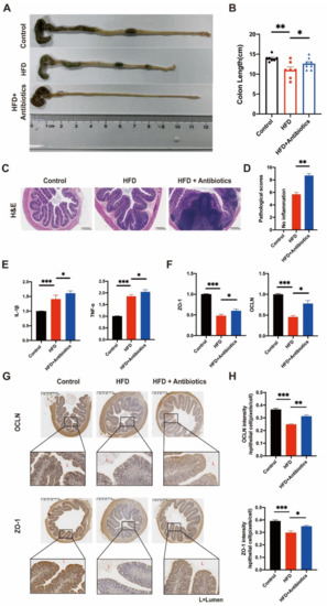 3.2. HFD Enhanced Mucosal Inflammation and Induced Mucosal Barrier Dysfunction in the Colon