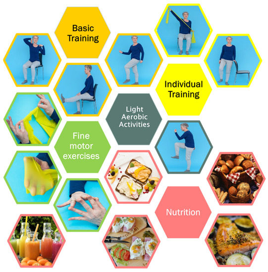 The methodological approach was based on the transtheoretical model considering individual needs, barriers and facilitators and the integration of training routines into everyday life [22]. Based on existing evidence [12,23,24], a portfolio with exercises which were considered safe and easily adaptable for different difficulty levels including sitting and standing positions was compiled. Aiming to maintain and practice capabilities and motions relevant for everyday functioning, exercises for endurance, strength, coordination and fine motor skills were included in the portfolio. Instructions comprised explanations of all single movements and exercises either with photos (paper-based instructions, PI) or with videos (digital instructions, DI). Single exercises were combined to “join-in” motion sequences for “basic training” of the upper and lower body parts in sitting and standing position. The videos included an additional music option to increase motivation during the exercise sessions. The basic training focused on endurance, strength and coordination. In addition, to meet special needs, specific exercises for the training of strength without (n = 4) and with resistance rubber bands (n = 10), and one sequence for balance and coordination were included. Addressing the issue of finger strength and function which is relevant especially for older people, e.g., for grasping, opening of medication bottles, etc., targeted exercises for fine motor skills of fingers (n = 7) were also included (Figure 1). Further examples are given in the Supplementary Materials, Box S1 basic training and Box S2 examples of specific exercises. Based on international guidelines [14], nutritional recommendations comprised information about macronutrients (e.g., proteins, carbohydrates, fats), micronutrients (e.g., vitamins) and fibers. In addition, the dietary recommendations included information and self-management advice for symptoms and side effects of the oncologic therapy (loss of appetite or taste, difficulties eating, chewing or swallowing, oral mucositis, dry mouth, nausea and vomiting, bloating, obstipation, diarrhea, unwanted weight gain and unwanted weight loss). In addition, easy recipes were compiled for helping and motivating participants to cook and eat (Figure 1).