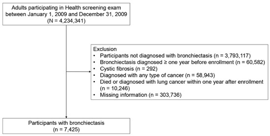 This study initially included 4,234,341 individuals aged ≥ 20 years who participated in the health screening exam between 1 January 2009 and 31 December 2009. We excluded participants who were not diagnosed with bronchiectasis (n = 3,793,117), those diagnosed with bronchiectasis more than one year before the enrollment period (n = 60,582), those diagnosed with cystic fibrosis (n = 292), those diagnosed with any type of cancer (n = 58,943), those who died or were diagnosed with lung cancer within one year after enrollment (n = 10,246), and those with missing data on at least one variable (n = 303,736). Thereafter, we finally identified 7425 participants with incident bronchiectasis (the bronchiectasis cohort). The cohort was followed from baseline to the date of incident lung cancer, death, or until the end of the study period (31 December 2018), whichever came first (Figure 1).