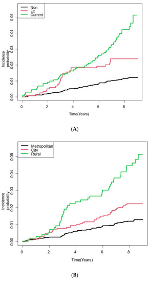In this study, participants living in rural areas were more likely to have a higher risk of incident lung cancer than those living in urban areas. Previous studies evaluating the differences in cancer incidence between rural and urban areas also have found that cancer incidence was significantly higher in rural areas than in urban area [37,38]. Although the reasons for this are not clear, the access to healthcare utilization is more limited in rural residents than in urban residents. Thus, there might be a disparity in the effective treatment of bronchiectasis between rural areas and other regions, and long-term inflammatory responses in patients in rural areas may lead to a high risk of lung cancer due to a lack of effective treatment. Another reason for this phenomenon may be low income in rural residents. Due to the lack of information on income in NHIS data, we alternately used type of insurance as an indicator of household income. Thus, there is a possibility that our adjustment for economic status might be insufficient. In addition, as the population of younger residents in rural areas has been decreasing continuously, most of the residents in those areas are older residents [39]. That might be a reason why the incidence of lung cancer was significantly higher in rural areas compared with other regions.