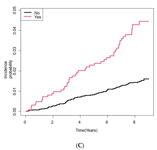 Cumulative incidence probability (/1000 person-years) of lung cancer in participants with bronchiectasis according to risk factors. (A) Smoking; (B) Residential area; (C) Chronic obstructive pulmonary disease.