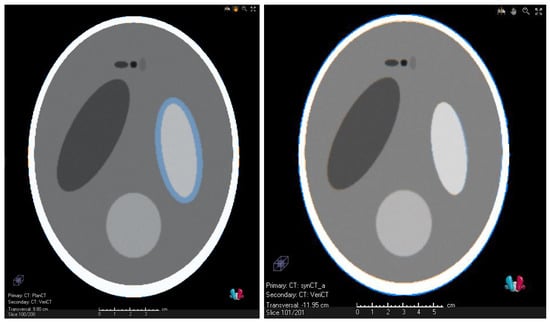 - A mathematical Shepp–Logan-type phantom. The similarity of the vCT and the sCT was also evaluated with the TRE (<3 mm) and additionally with the Dice similarity coefficient (DSC) (>0.85) criterion [30].