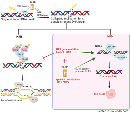 In cancers with HRD, poly(adenosine diphosphate-ribose) polymerase inhibitors (PARPi) have become the breakthrough targeted therapy, particularly in ovarian cancer in which it was first studied clinically [118]. The rationale behind PARPi use in HRD is explained by the concept of synthetic lethality wherein efficient DDR is severely compromised when multiple repair pathways are inhibited (Figure 2) [119]. To simplify this concept, if a mutation in the HRR gene inhibits this pathway, synthetic lethality is established when PARPi directly blocks the base excisions repair (BER) pathway. This scenario creates a reliance on error-prone non-HRR pathways, such as NHEJ (which is also directly promoted by PARPi), and leads to cell death [119,120,121].
