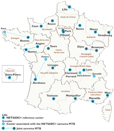 - Fayet, Y.; Tétreau, R.; Honoré, C.; Le Nail, L.-R.; Dalban, C.; Gouin, F.; Causeret, S.; Piperno-Neumann, S.; Mathoulin-Pelissier, S.; Karanian, M.; et al. Determinants of the Access to Remote Specialised Services Provided by National Sarcoma Reference Centres. BMC Cancer 2021, 21, 631. [Google Scholar] [CrossRef]