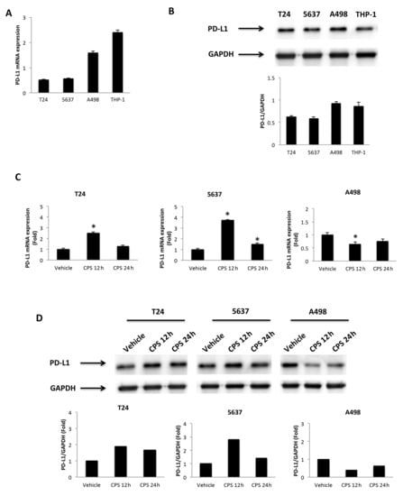 CPS treatment influences PD-L1 expression. (A) The relative PD-L1 mRNA expression in T24, 5637, A498 and THP-1 (positive control) cell lines was evaluated by qRT-PCR. PD-L1 mRNA levels were normalized for GAPDH expression. Data are expressed as mean ± SD. (B) Western blot analysis of PD-L1 protein levels. Blots are representative of one of three separate experiments. PD-L1 densitometry values were normalized to GAPDH, used as the loading control. Data are expressed as mean ± SD. (C) PD-L1 mRNA expression in T24, 5637 and A498 cell lines treated with 50 μM CPS for 12 and 24 h was evaluated by qRT-PCR. PD-L1 mRNA levels were normalized for GAPDH expression. Data are expressed as mean ± SD; * p < 0.05. (D) Western blot analysis of PD-L1 protein expression in T24, 5637 and A498 cell lines treated with 50 μM CPS for 12 and 24 h. Blots and densitometry values are representative of one of three separate experiments. PD-L1 densitometry values were normalized to GAPDH, used as the loading control. The PD-L1 protein levels of treated cells were determined with respect to PD-L1 levels of vehicle-treated cells. Detailed information about the Western blotting can be found in Figure S6.
